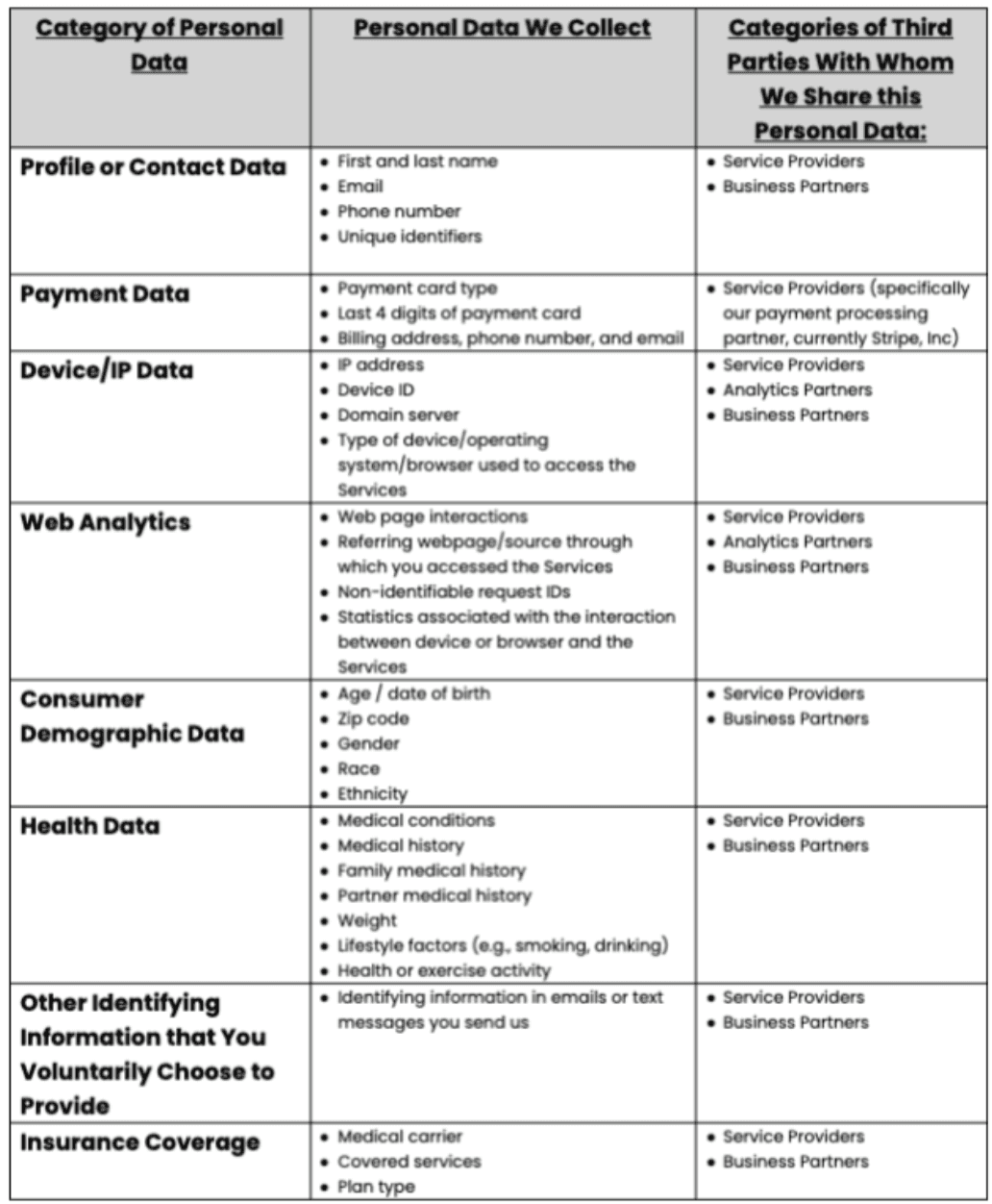 This chart details the categories of Personal Data that we collect or have collected and with whom we share it: